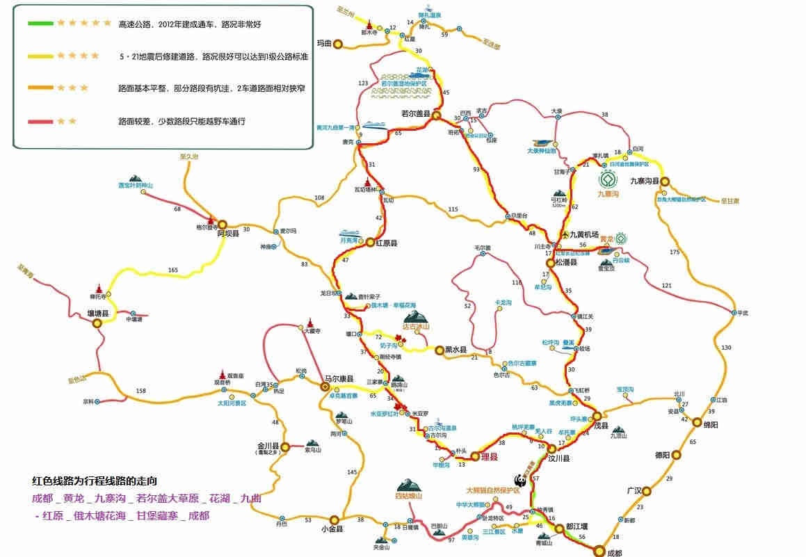 红原—月亮湾—(红原花海或达格则)—甘堡藏寨—成都