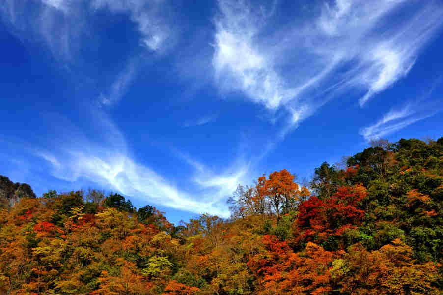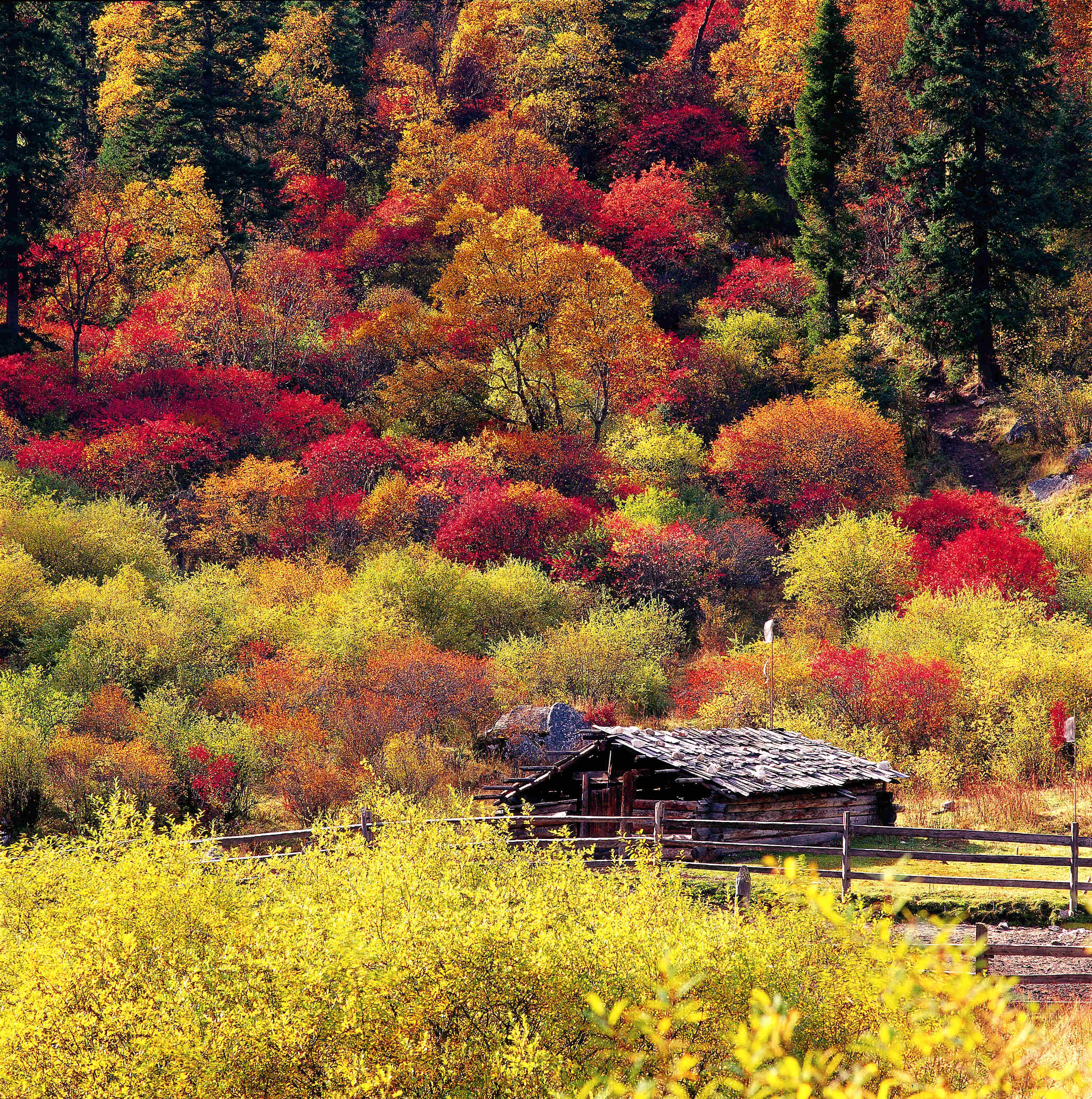 黑水奶子沟理县米亚罗红叶特写:彩林是黑水又一道靓丽的风景。"奶子沟"在藏语中是美丽富饶、幸福安宁之意。奶子沟八十里彩林风情谷因身处深谷独享清幽雅静的奶子沟而得名,又以美甲天下的彩林世界而闻名。这里植被丰茂,阳光灿烂,氧气充足,是个天然的大"氧吧"。奶子沟位于黑水县城西9公里处,从马桥沿着宽阔平坦的柏油马路直至垭口夏山脚下。可谓"八十里彩林,八十里画廊"。蜿蜒流淌的河流两旁群山叠嶂,河两边的山地上长满了阔叶林、次生林和灌木丛。主要树种有桦树、青杠、枫树、花楸、白杨、沙棘、海棠等;主要灌丛有高山柳、三颗针等。每当金秋季节万山红遍,层林尽染,山是红的、水是红的、紫红、深红、橘红、粉红、金黄、鹅黄、草绿、墨绿、咖啡色、褐色……的树叶应有尽有;彩林中若隐若现的古老藏寨、磨坊,游弋的牛羊,藏家人友好纯朴的笑脸,藏家女孩百灵鸟般的歌声,同远处座座洁白晶莹的雪山交融在一起,构成一幅幅万紫千红、五彩缤纷的彩色画卷。米亚罗红叶景区面积达3688平方公里,景区植被覆盖面积90%,森林覆盖面有75%,山、水、林生态环境保持优良。金秋时节,万树姹紫嫣红,争奇斗艳。斑斓的色彩与蓝天、白云、山川、河流构成一幅醉人的金秋画卷。刚好应证了唐代著名诗人杜牧“停车坐爱枫林晚,霜叶红于二月花”的千古名句。